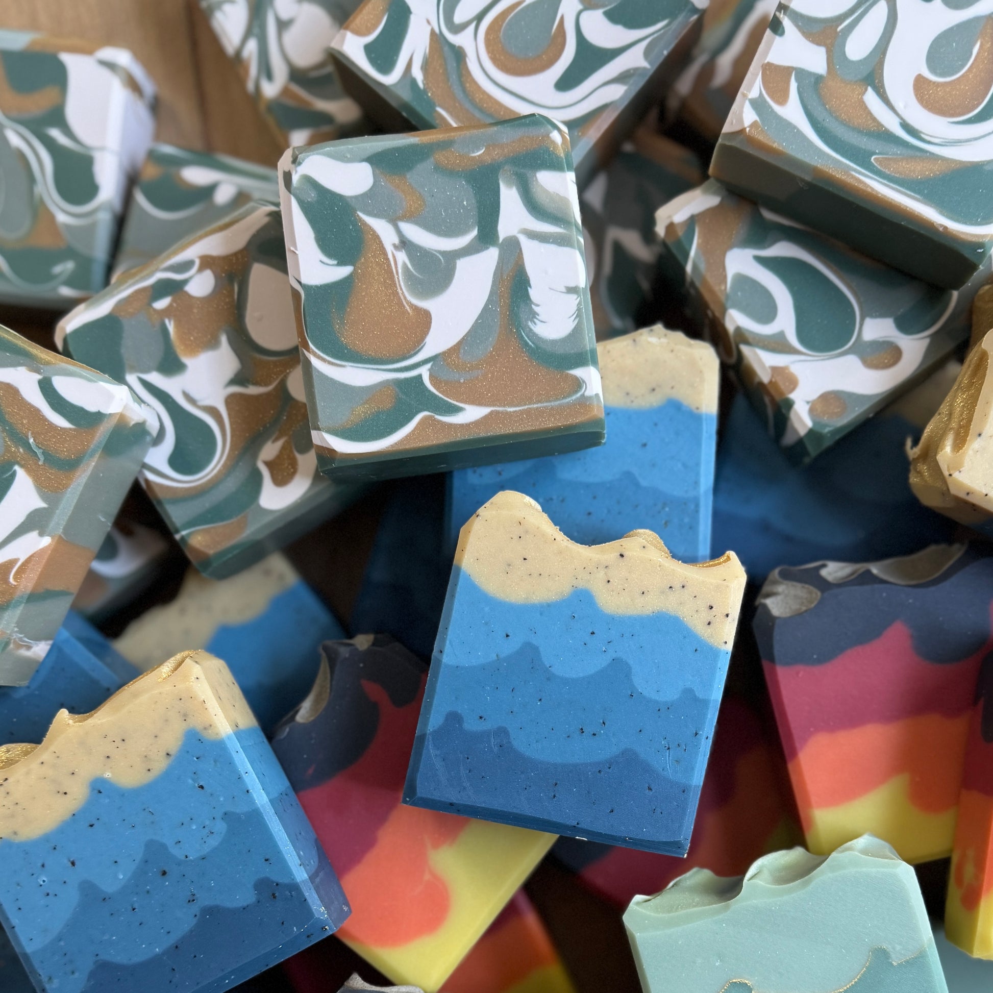 This handcrafted vegan soap blends crisp mint with earthy oakmoss and warm musk, creating a scent that is both refreshing and grounding. Bold swirls of deep green with shimmering gold, like sunlight breaking through forest branches, make each bar a visual stunner.