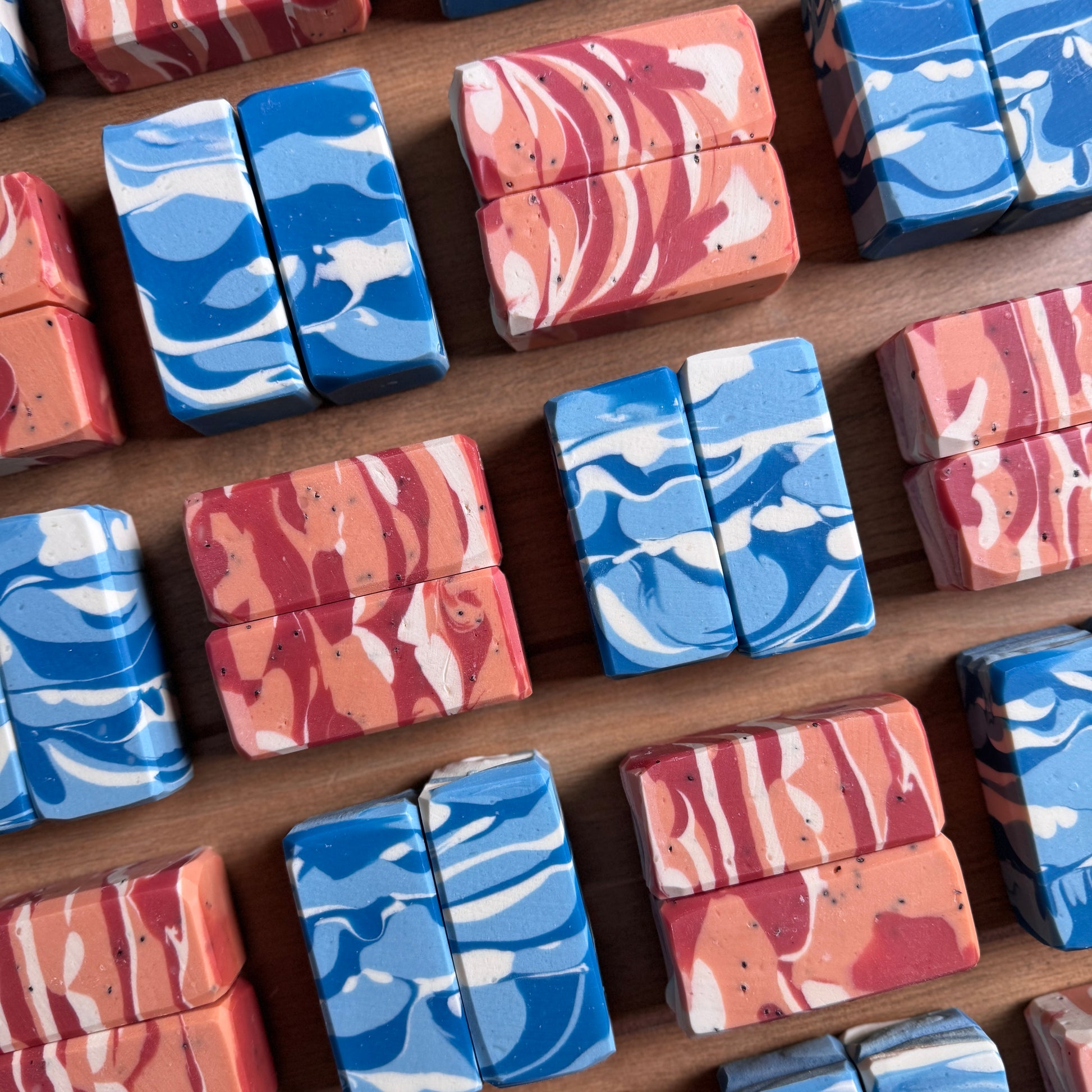 Made with our signature blend of olive oil, coconut oil, cocoa butter, and castor oil, it offers up a creamy lather that’s both gentle and nourishing. The icy blue and white swirls perfectly embody the refreshing cleanse you’ll experience with every wash.