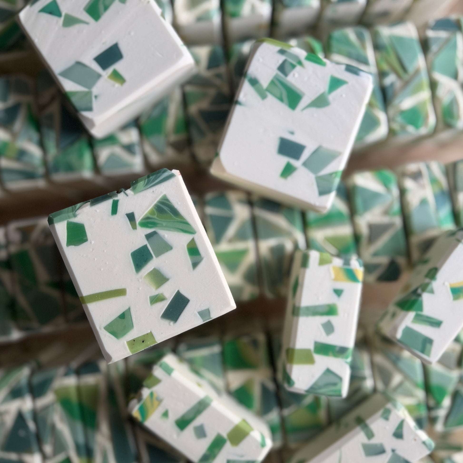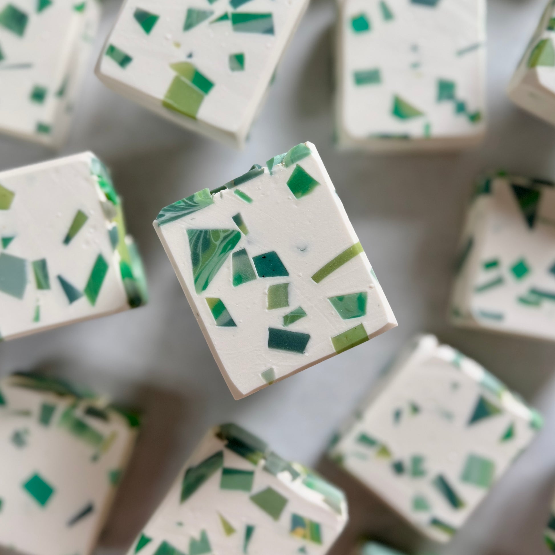 Celebrate the season with Pine, a handcrafted vegan soap that captures the crisp, cozy magic of winter. This stunning holiday favorite features a creamy white base swirled with chopped green soap confetti, a playful nod to snow-dusted evergreens.